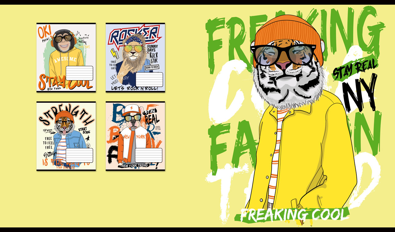 1. Street art poster with Rock Star Lion with sunglasses on pastel navy backdrop 2. Street art poster with Hipster Tiger in a blue shirt on pastel yellow backdrop 3. Street art with Monkey Music Lover in a yellow hoodie on a pastel white backdrop 4. Street art with New York Trend Real Dog in a cap on a pastel beige backdrop 5. Street art with Freaking Cool Tiger in an orange hat on a light yellow backdrop