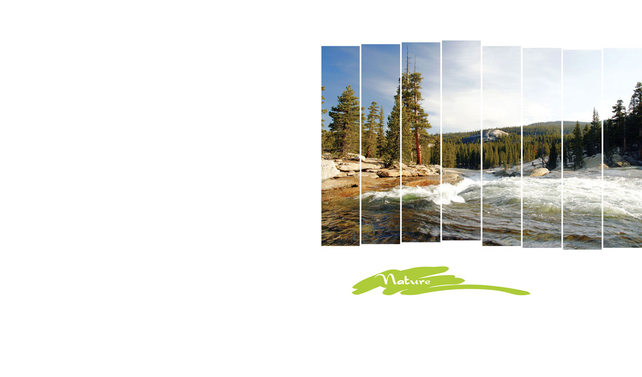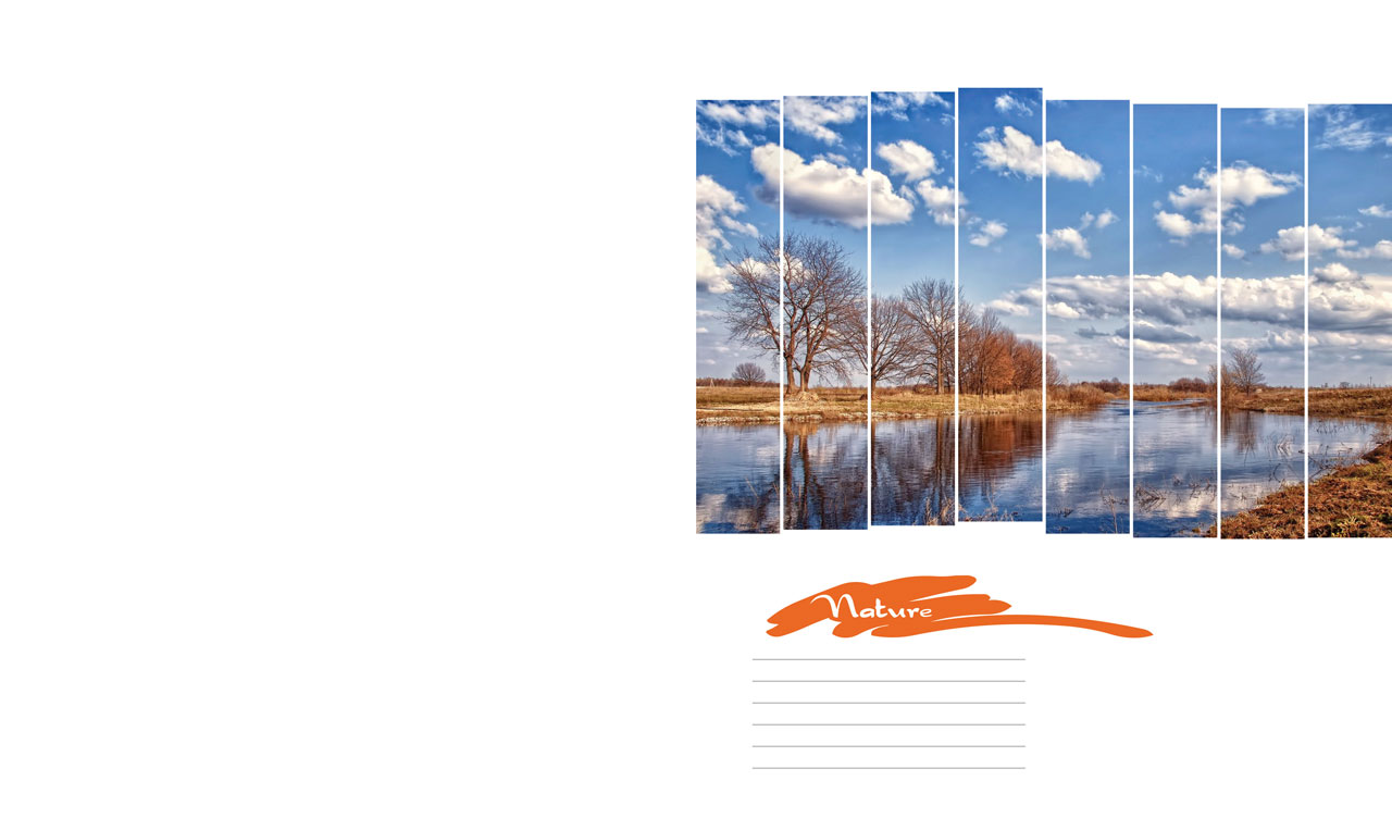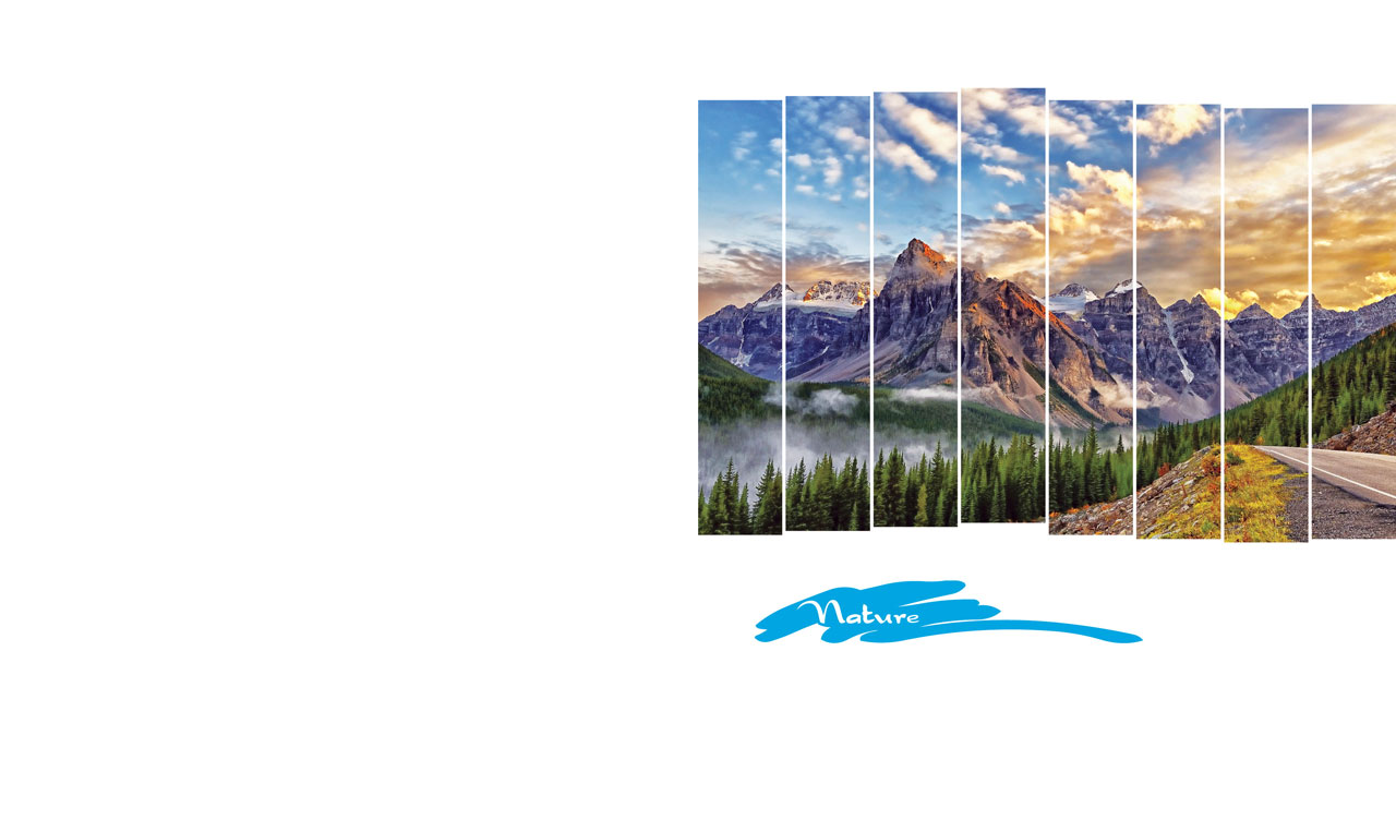 1. Panorama of a mountain range and a spruce forest in vertical frames on white 2. Panorama of a mountain lake shrouded in ice in vertical frames on white 3. Panorama of a river flowing through a spruce forest in vertical frames on white 4. Panorama of fall trees under an autumn cloudy sky in vertical frames on white