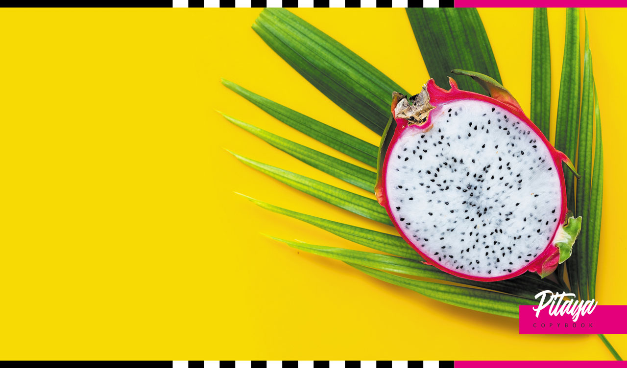 1. Half of a pitaya on a palm branch on a yellow backdrop