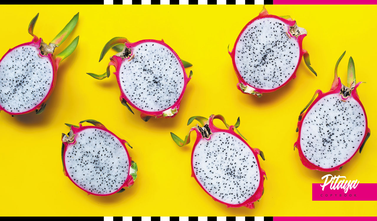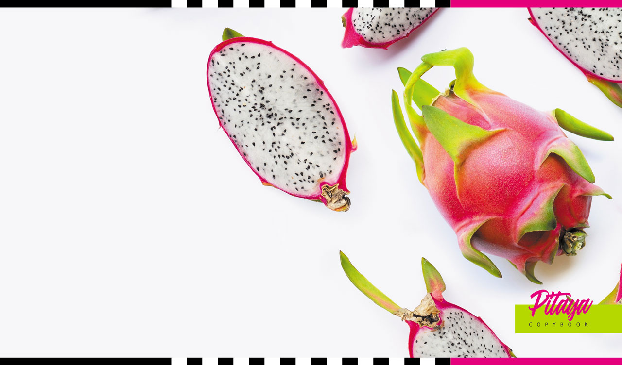 4. Half a pitaya on a green backdrop and half a lime on a red-pink backdrop
