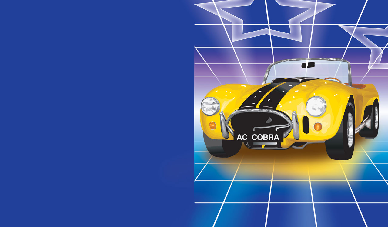 1. Classic yellow convertible sports car with black hood stripes on blue