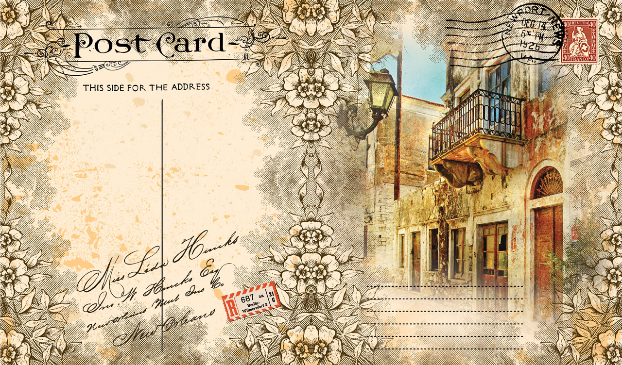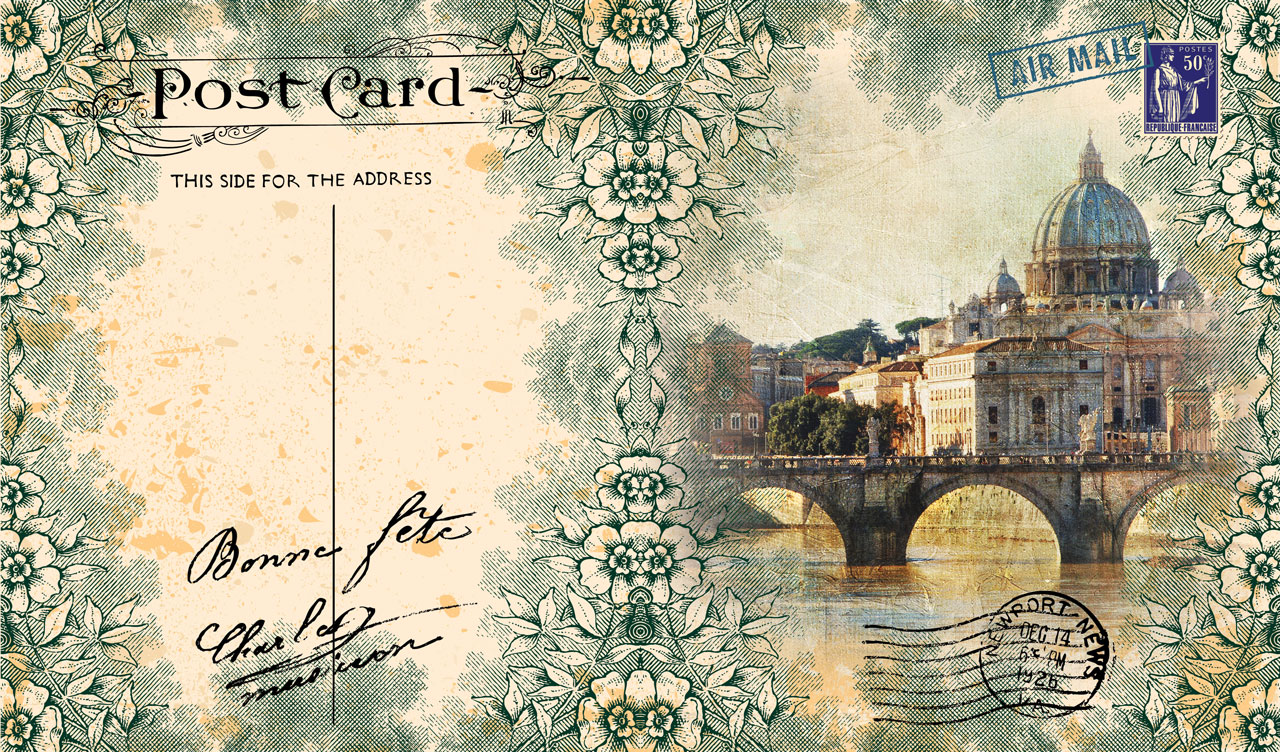 1. An old lamppost by the bridge framed with a floral stencil on a vintage postcard 2. Stone bridge and a cathedral framed with a floral stencil on a vintage postcard 3. Lampposts by the palace framed with a floral stencil on a vintage postcard 4. Shabby facade in an old town framed with a floral stencil on a vintage postcard 5. Stone bridge and buildings framed with a floral stencil on a vintage postcard