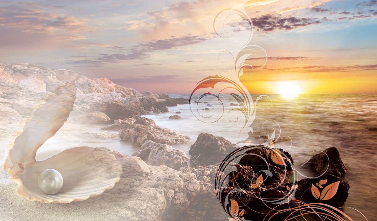 1. Spruces on the boulder bank of the blue river behind a translucent swirl curtain 2. Golden sea sunset on a black rock beach behind a translucent swirl curtain 3. Mountain lake under the blue cloudy sky behind a translucent swirl curtain 4. Red-orange sunset over the gray ocean waves behind a translucent swirl curtain