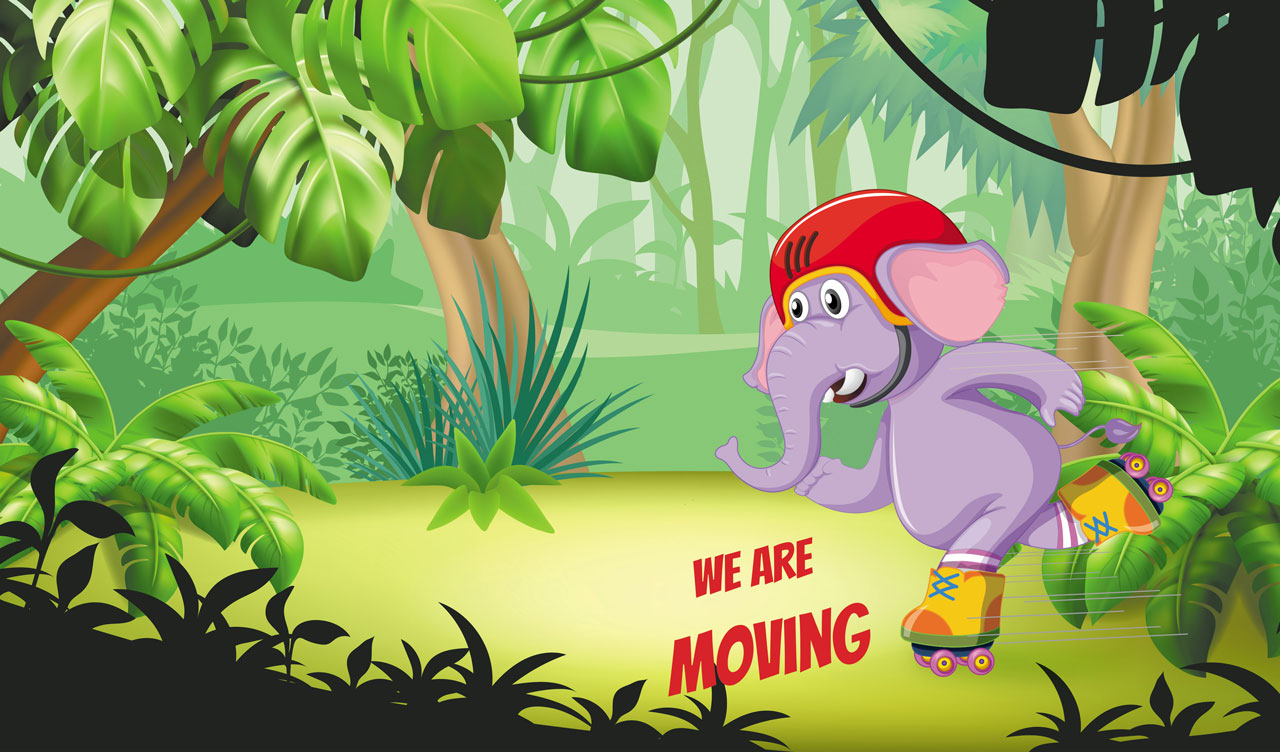 1. Cartoon elephant glides on roller skates among the trees of a green lush jungle 2. Cartoon giraffe glides on roller skates among the palms of an ocher desert 3. Cartoon monkey glides on roller skates by a blue savannah lake 4. Cartoon tiger drives a scooter on an ocher dirt road in a green fir forest 5. Cartoon raccoon slides on a skateboard in a dense green forest