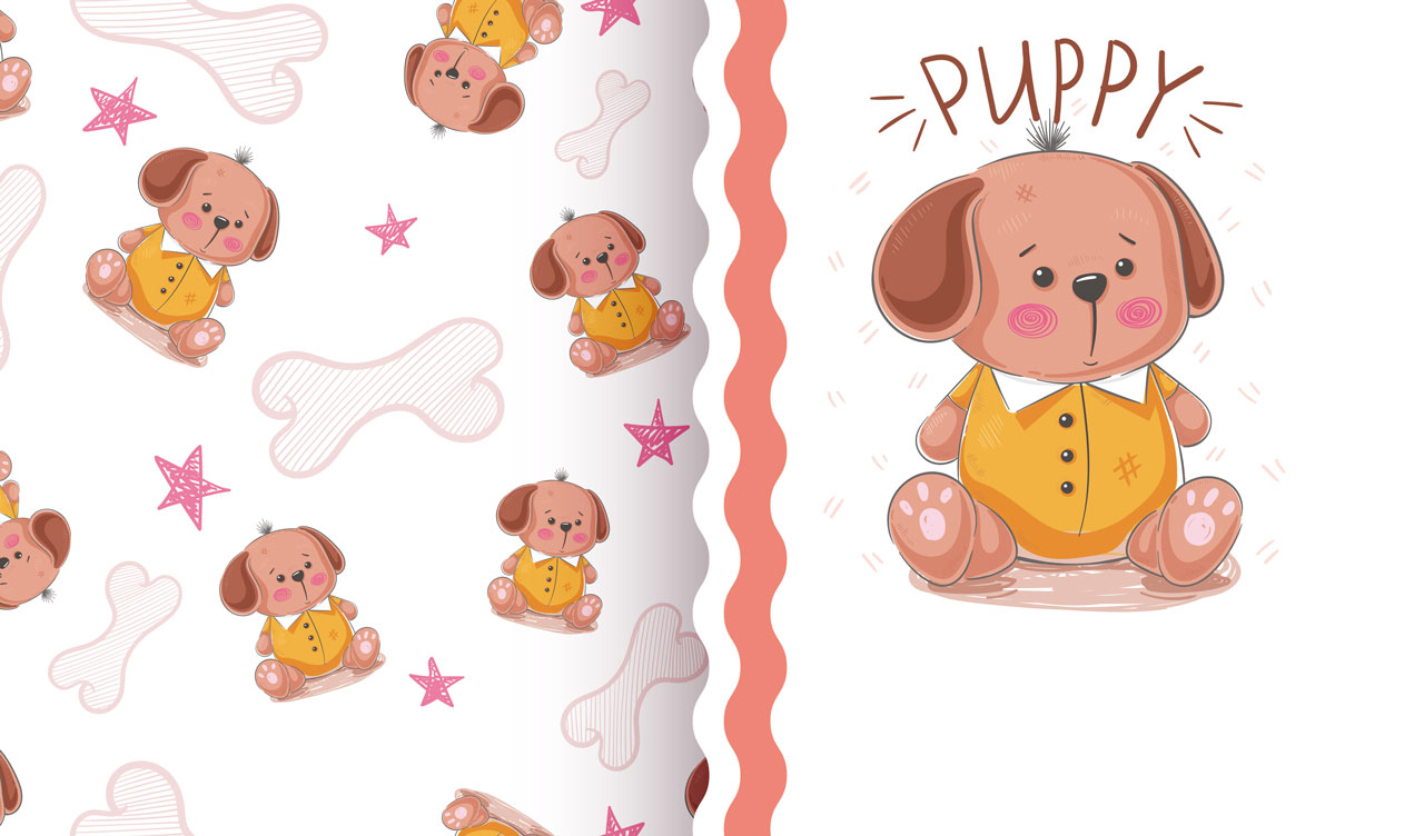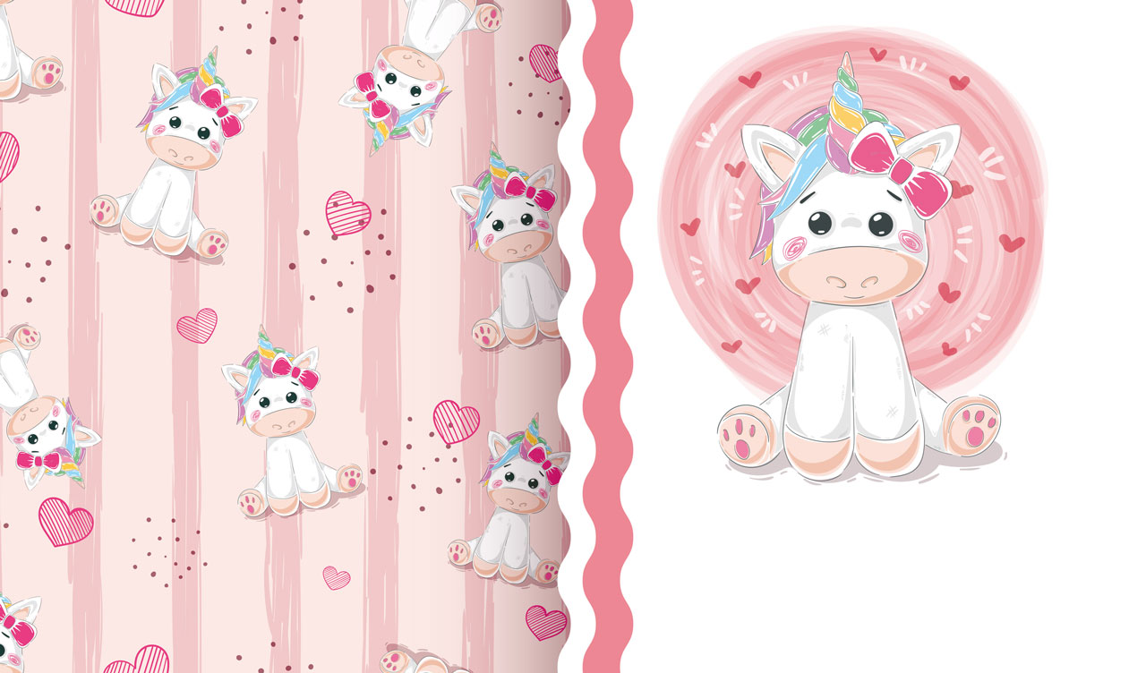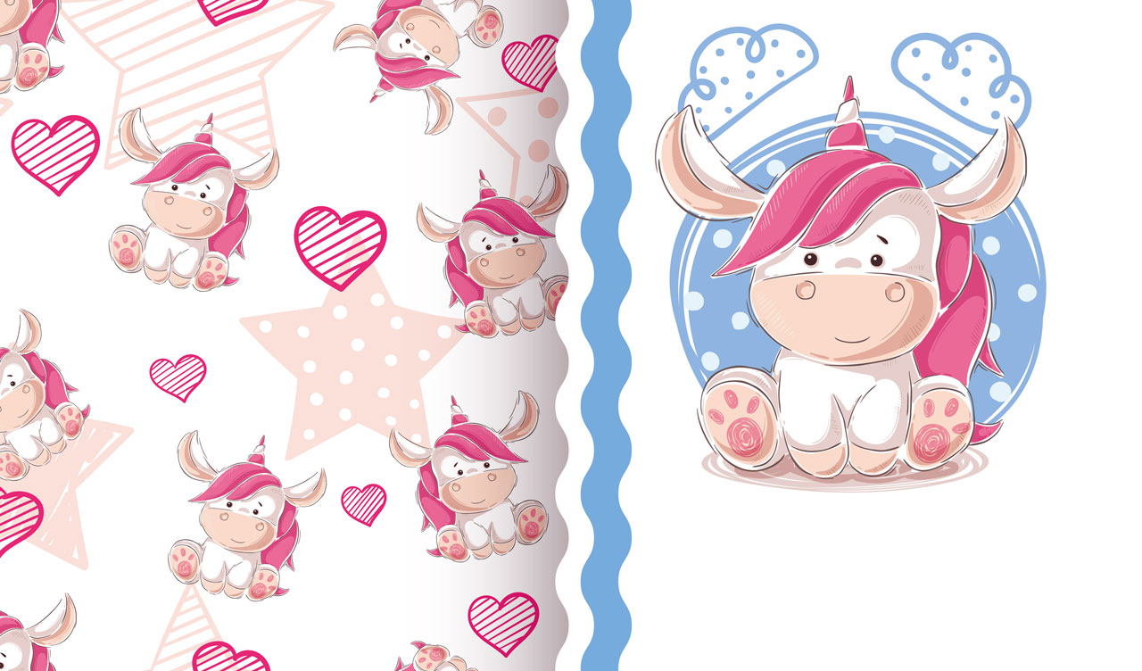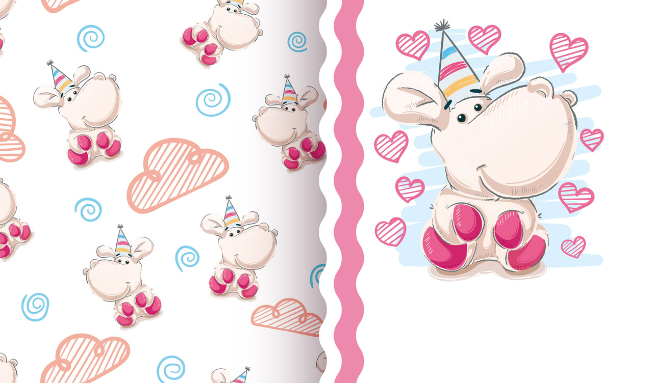 1. Baby unicorn on a white backdrop with a seamless patterned side panel 2. Baby hippo on a white backdrop with a seamless patterned side panel 3. Rainbow unicorn on a white backdrop with a seamless patterned side panel 4. Puppy in a shirt on a white backdrop with a seamless patterned side panel 5. Baby elephant princess on a white backdrop with a seamless patterned side panel