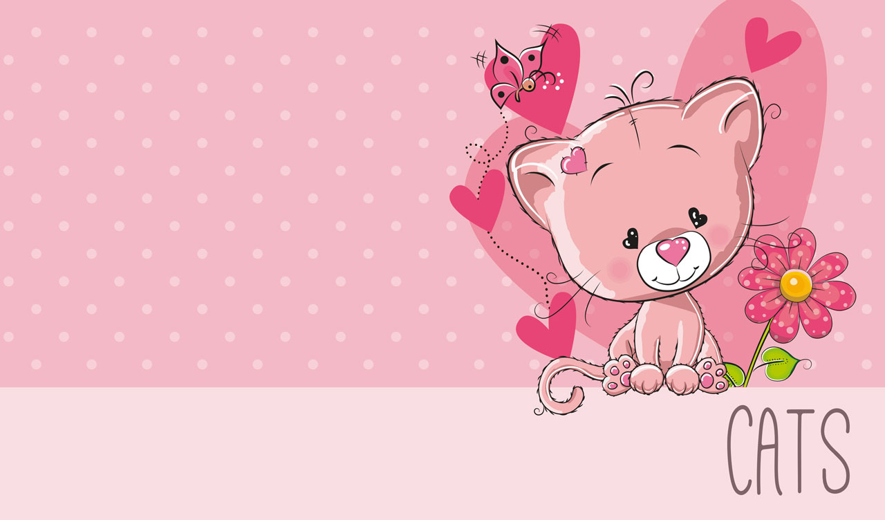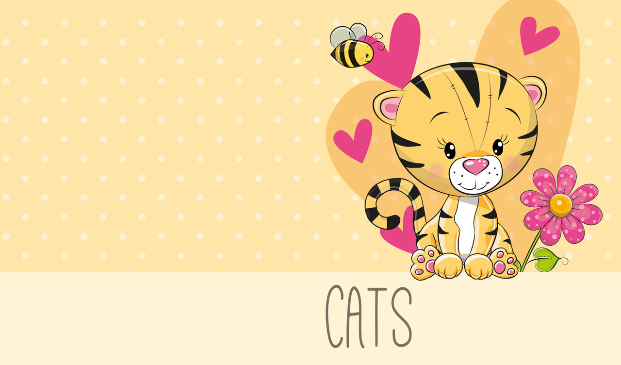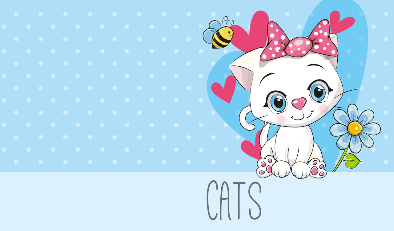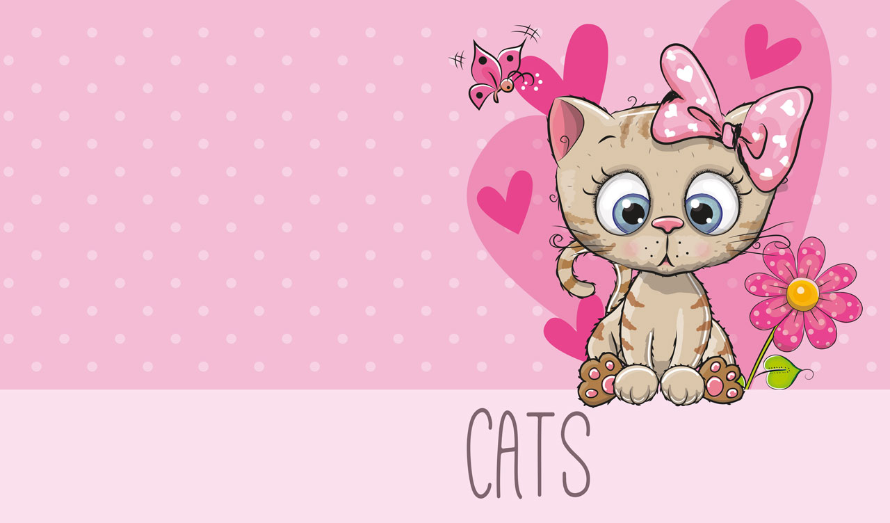 1. Animated tabby kitten on a pastel pink polka dot and heart patterns 2. Animated white kitten on a pastel blue polka dot and heart patterns 3. Animated navy black kitten on a pastel purple polka dot and heart patterns 4. Animated tiger cub on a pastel yellow polka dot and heart patterns 5. Animated pink kitten on a pastel pink polka dot and heart patterns