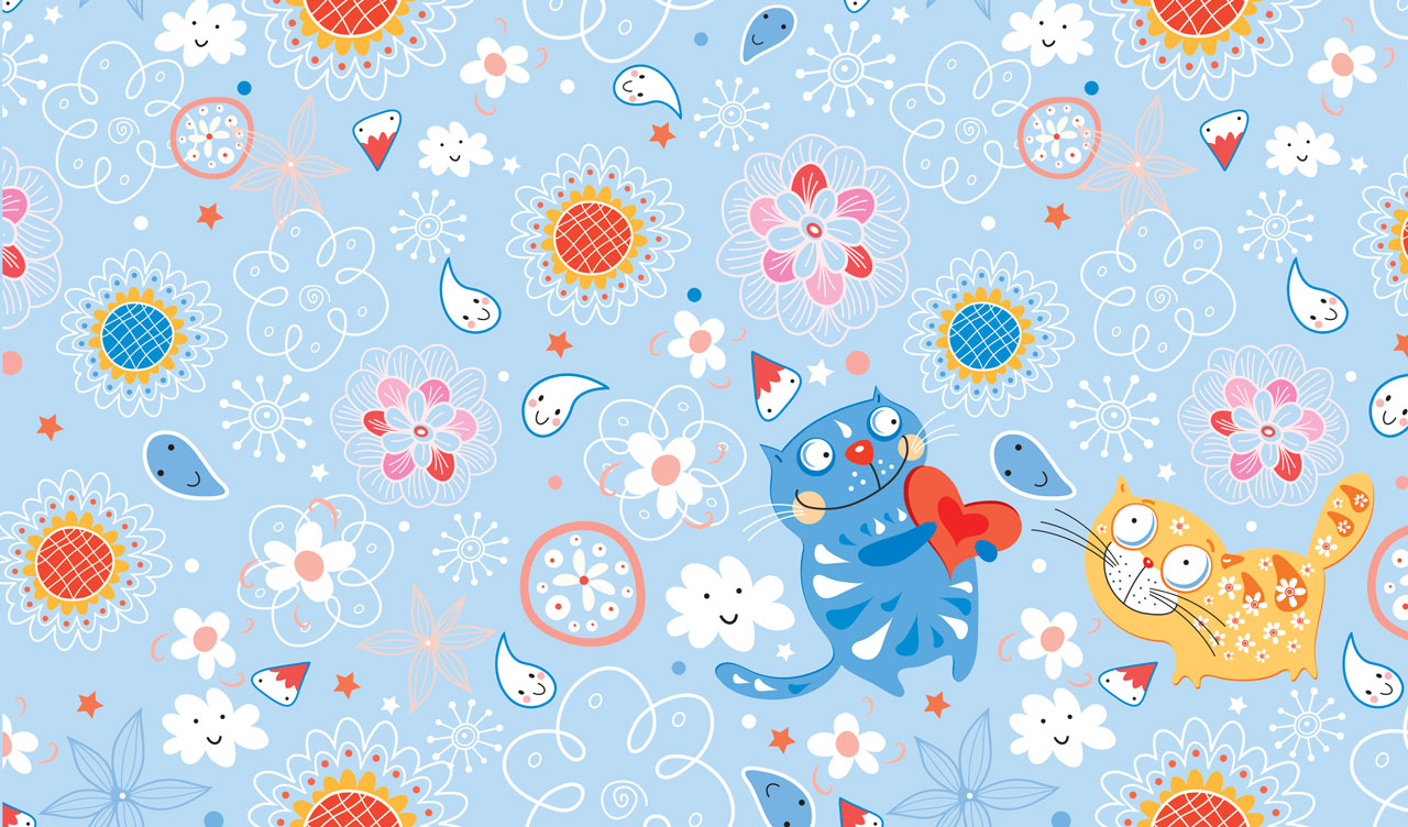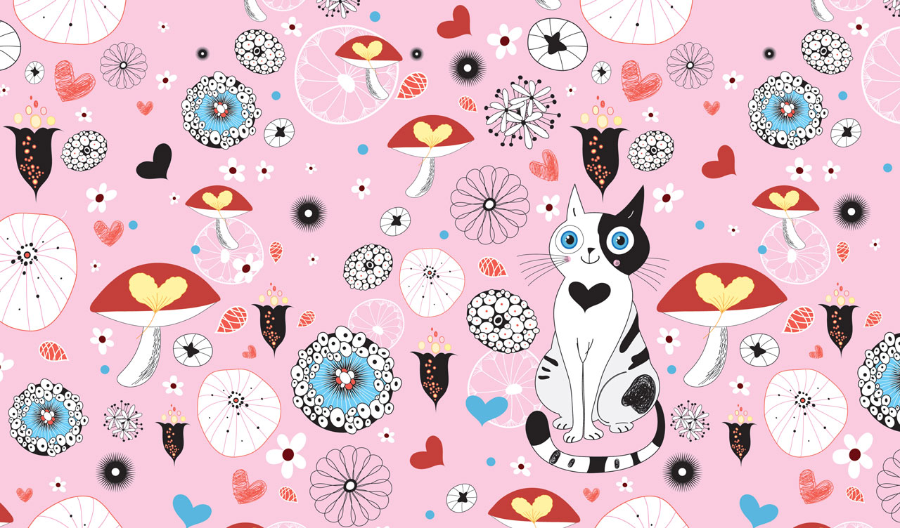 1. Black and white cat surrounded by mushrooms, flowers and hearts on pastel pink 2. Couple of happy cats surrounded by rain drops, flowers and clouds on pastel blue 3. Couple of black and white cats surrounded by floral patterns on pastel green 4. Black cat and a pink cat surrounded by conifer cones and swirls on pastel beige