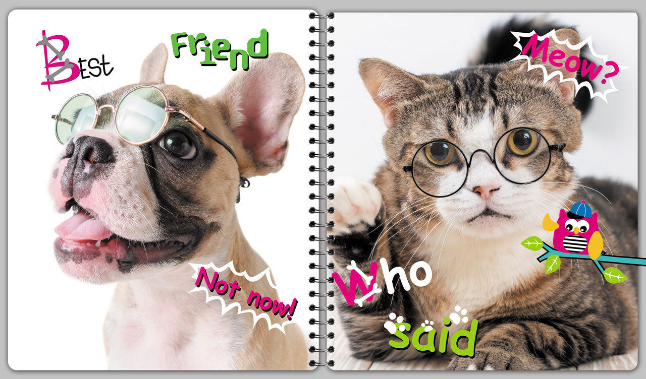 1. Red tabby cat and fluffy Poodle having fun on the covers of a spiral notebook 2. British Shorthair and Jack Russell Terrier on the covers of a spiral notebook 3. Tabby cat and French Bulldog wearing glasses on the covers of a spiral notebook 4. Calico cat and Pug having fun on the covers of a spiral notebook 5. British Shorthair and Russian Toy having fun on the covers of a spiral notebook