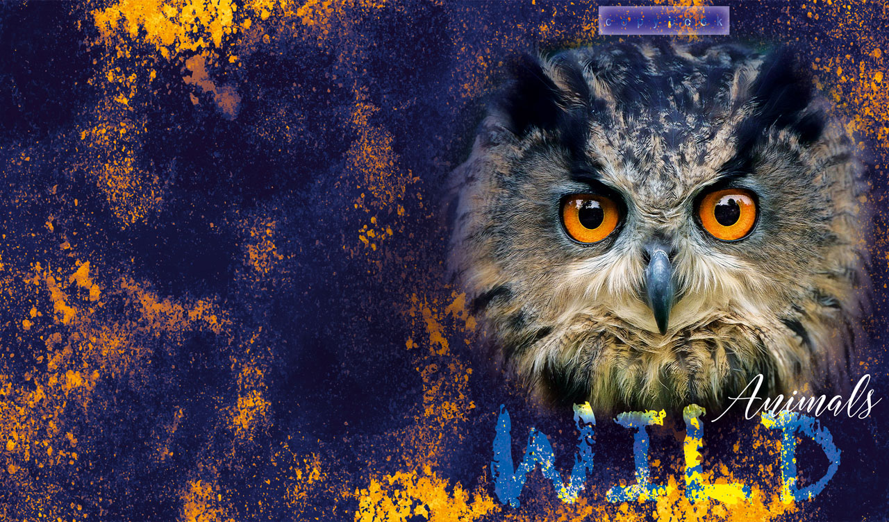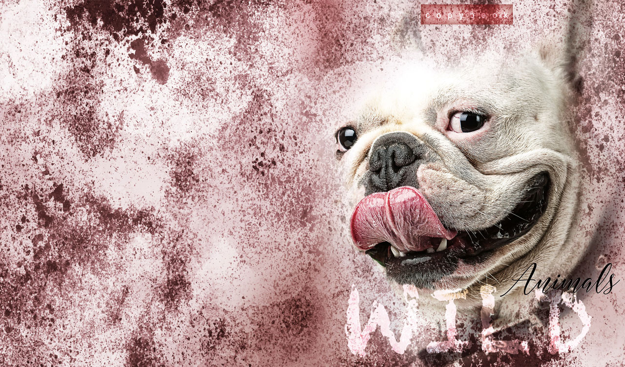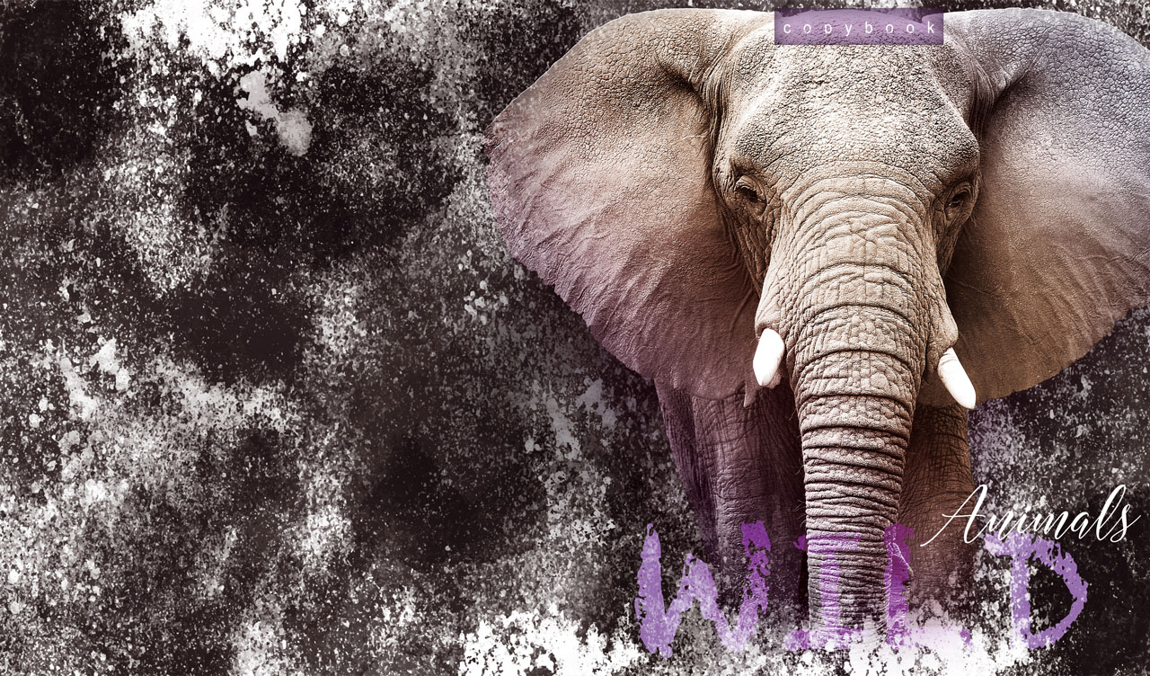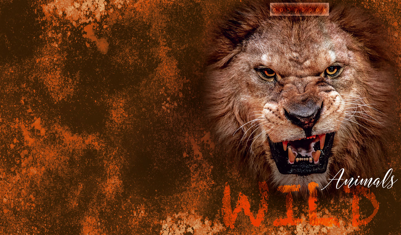 1. American Bulldog vignetted portrait on white and maroon grunge-style texture 2. Roaring lion vignetted portrait on dark orange and brown grunge-style texture 3. Eurasian eagle-owl vignetted portrait on navy and orange grunge-style texture 4. African elephant vignetted portrait on white and black grunge-style texture 5. Roaring tiger vignetted portrait on dark brown and yellow grunge-style texture