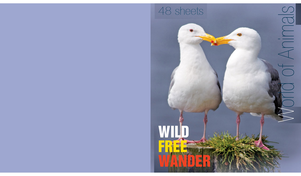1. Couple of wild white western gulls on a gray monochrome backdrop 2. Couple of gray dolphins on the water surface on a blue monochrome backdrop 3. Couple of wild lions in love on a tan monochrome backdrop 4. A pair of wild horses embrace their necks on a pastel green monochrome backdrop