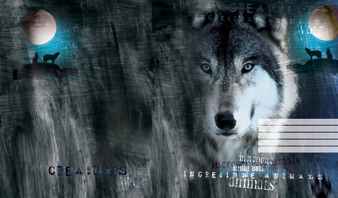 Wild grey wolf with blue eyes, on the blurred dark grey background of strokes, and a thumbnail view of wolves howl at the full moon.