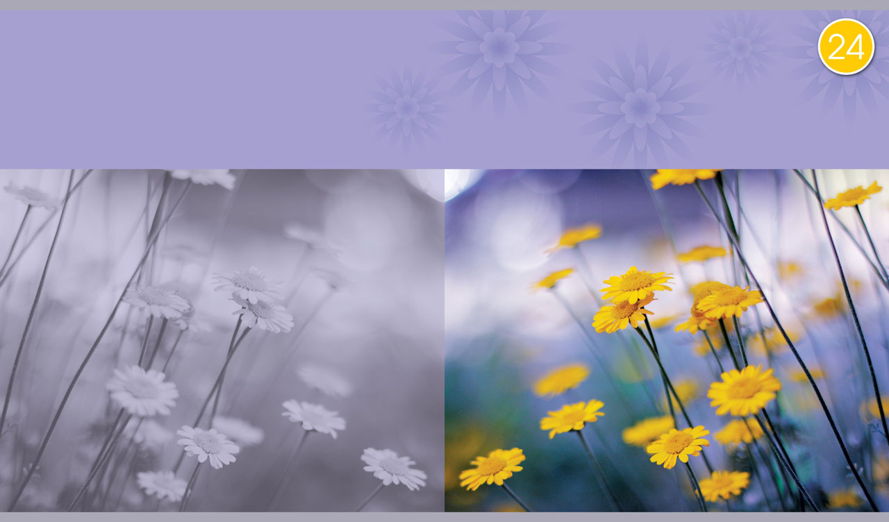 Yellow daisies against a blurry bokeh backdrop and its duplex monochrome on a floral patterned light violet background.