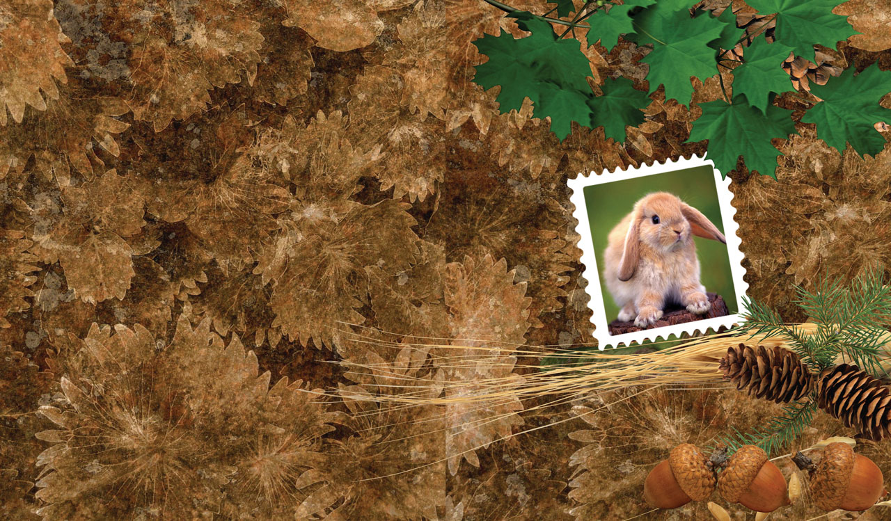 2. Bunny in a postage stamp frame on dry leaves background with acorns and cones