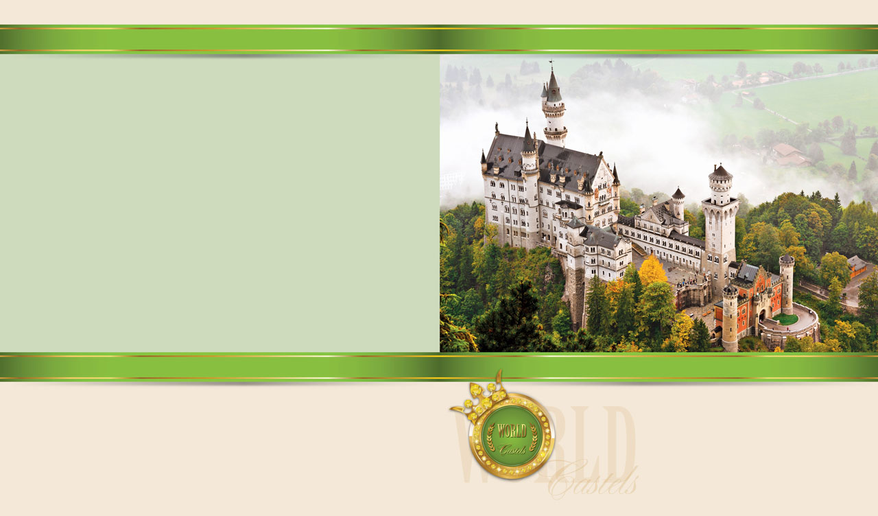 1. Landscape of Windsor Castle with green lawns in a blue frame on pastel beige 2. Landscape of Castle of Sully-sur-Loire at sunset in a blue frame on pastel beige 3. Aerial view of Neuschwanstein Castle in mist in a green frame on pastel beige 4. Kreuzenstein Castle landscape against the blue sky on red and pastel beige